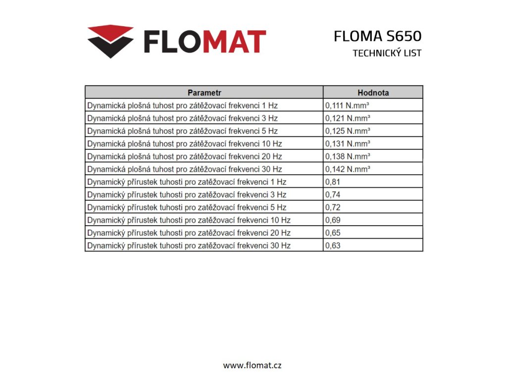 Antivibrační tlumící rohož FLOMA S650 je elastomerická deska vyrobena ze směsi pryžového granulátu SBR a polyuretanového pojiva. Díky tomuto složení perfektně slouží jako ochrana proti chvění, vibracím a také jako izolace budov, vozovek, pilířů a nosníků.