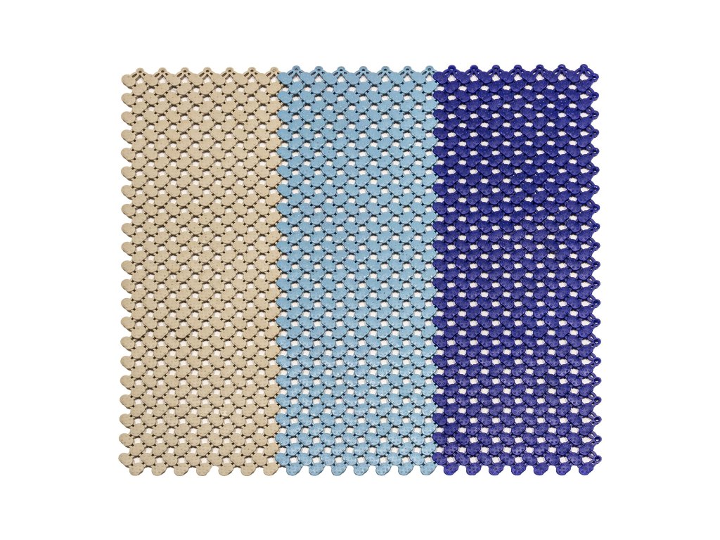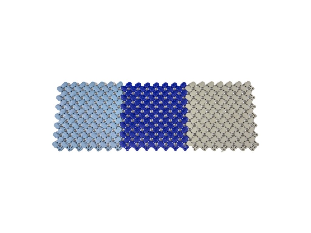 Rohožka je modulární, což umožnuje dosáhnout v podstatě jakéhokoliv rozměru a to velice snadným napojením jednotlivých modulů na sebe (viz foto). Lze také kombinovat různé barvy (nabízíme béžovou, zelenou, modrou) a tím dosáhnout zajímavých designů. V případě potřeby lze rohož zkrátit (seříznout nožem), aby rohož pasovala například okolo stěn.