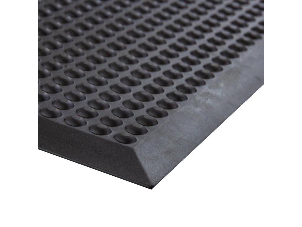 Rohož je vyrobena z NBR pryže (ne z PVC), proto vydrží více pochozích cyklů a má lepší odolnost vůči opotřebování. Po obvodu je rohož vybavená náběhovou hranou pro prevenci zakopnutí.