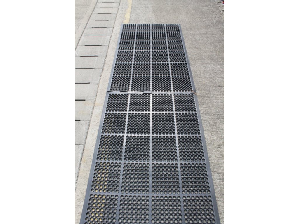 Černá gumová modulární průmyslová protiúnavová protiskluzová olejivzdorná rohož vyrobená z přírodní gumy a 25 % nitrilové směsi. Pohodlný povrch rohože zmírňuje únavu způsobenou dlouhým stáním.