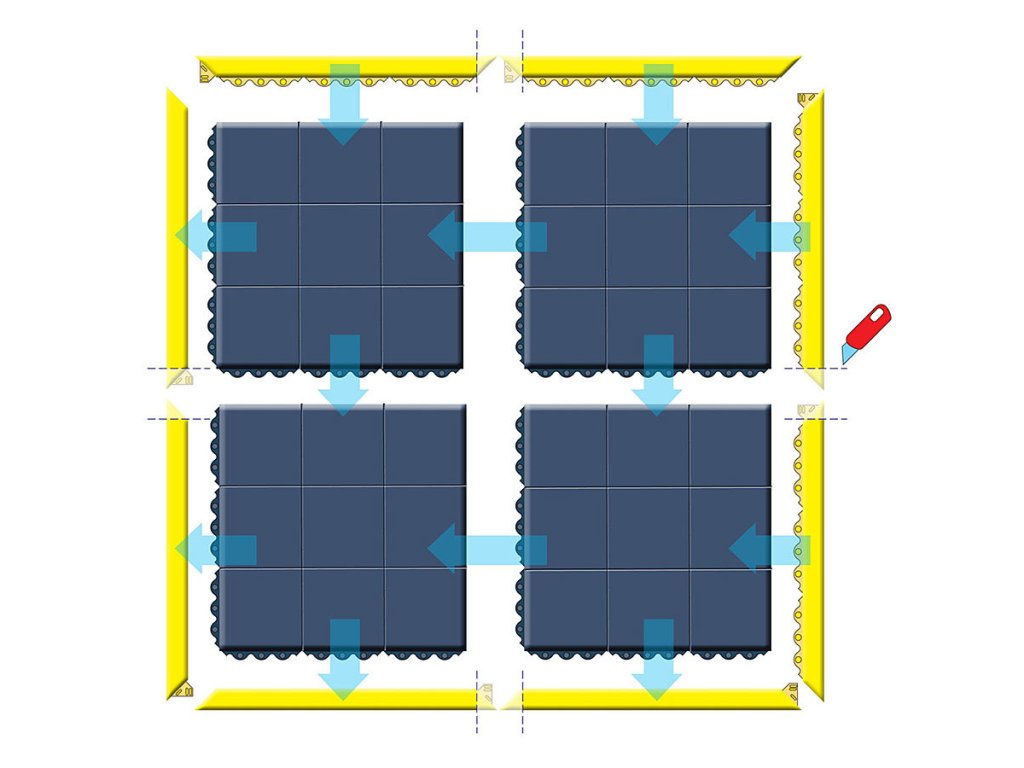 Zámky rohoží umožňují napojení rohoží v podélném i příčném směru. Přímo na místě z nich lze vytvářet ostrůvkové konfigurace nebo celoplošně pokrýt i složitě členitá pracoviště. Na výborných protiúnavových vlastnostech se podílí jak konstrukce rohože, tak i kvalita použitých surovin.