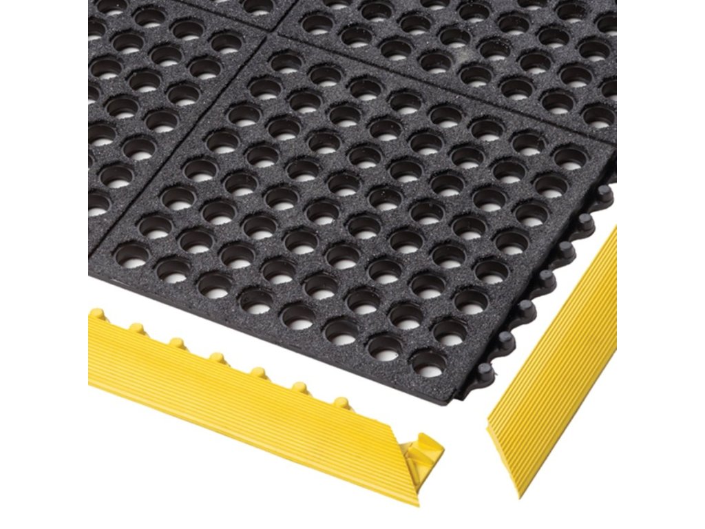 Černá gumová rohož Cushion Easy Nitrile GSII FR s korundovou protiskluzovou úpravou a otvory pro odvod nečistot z povrchu umožňuje snadné odvětrávání a udržuje pracoviště suché a čisté. Rohož je tvořena čtvercovými modulovými segmenty z odolné gumové směsi o rozměru 91 × 91 cm. Tyto moduly lze snadno propojit a pokrýt jimi jak rozlehlá pracoviště, tak individuální pracovní stanice. Vysokou ergonomii zajišťuje protiskluzný povrch s korundovou vrstvou, která zvyšuje tření i v extrémně kluzkých podmínkách, a 19 mm silná, pružná konstrukce rohože, poskytující vysoký pracovní komfort v suchém i mokrém průmyslovém prostředí.