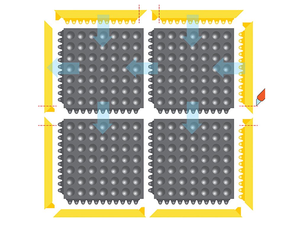 Jedinečný design a zpracování umožňují rychlou instalaci i bezproblémovou manipulaci s rohoží. Řezací mřížka, vyznačená na rubu, usnadňuje dělení rohože po modulech 30 x 30 cm a činí přizpůsobení rohože ještě snazším. Zkosené hrany proti zakopnutí dovolují formovat vnitřní i vnější rohy.