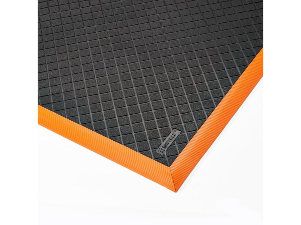 Černo-oranžová extra odolná průmyslová olejivzdorná rohož Safety Stance Solid je vyrobena ze 100% nitrilové směsi odolné průmyslovým olejům a chemikáliím. Vhodná do vícesměnných provozů. Protiúnavové rohože nejvyšší kvality určené do průmyslového prostředí s vysokou zátěží. Povrch Diamond Grid garantuje bezpečnou chůzi, kanálky zachycují úniky oleje.