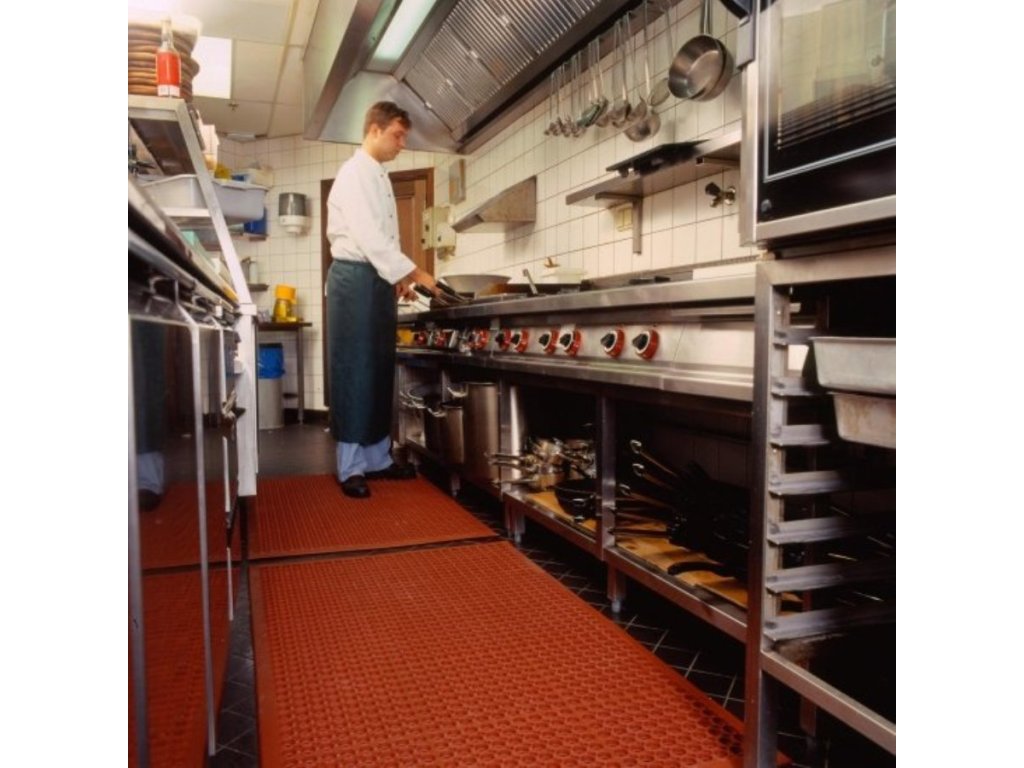 Červená gumová protiskluzová kuchyňská rohož Sanitop Red je rohož do mokrého prostředí. Drenážní otvory umožňují odvětrávání, protékání tekutin a propadávání nečistot, povrch tak zůstává suchý a čistý. Pravidelné čištění saponátem a tlakovou vodou prodlužuje jejich životnost. Neobsahují silikon, jsou vhodné i do lakoven. Rohože nabízejí ergonomický přínos ze stání na 12,7 mm vysoké podložce.