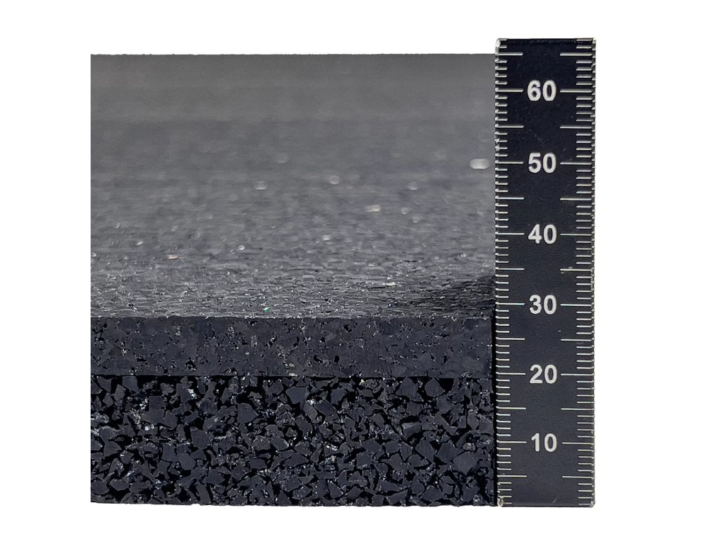 Spodní část: Antivibrační elastomerická guma S650 vyrobená ze směsi pryžového granulátu SBR a polyuretanového pojiva. Tato antivibrační gumová deska má široké využití jako univerzální tlumící, protihluková a antivibrační deska.