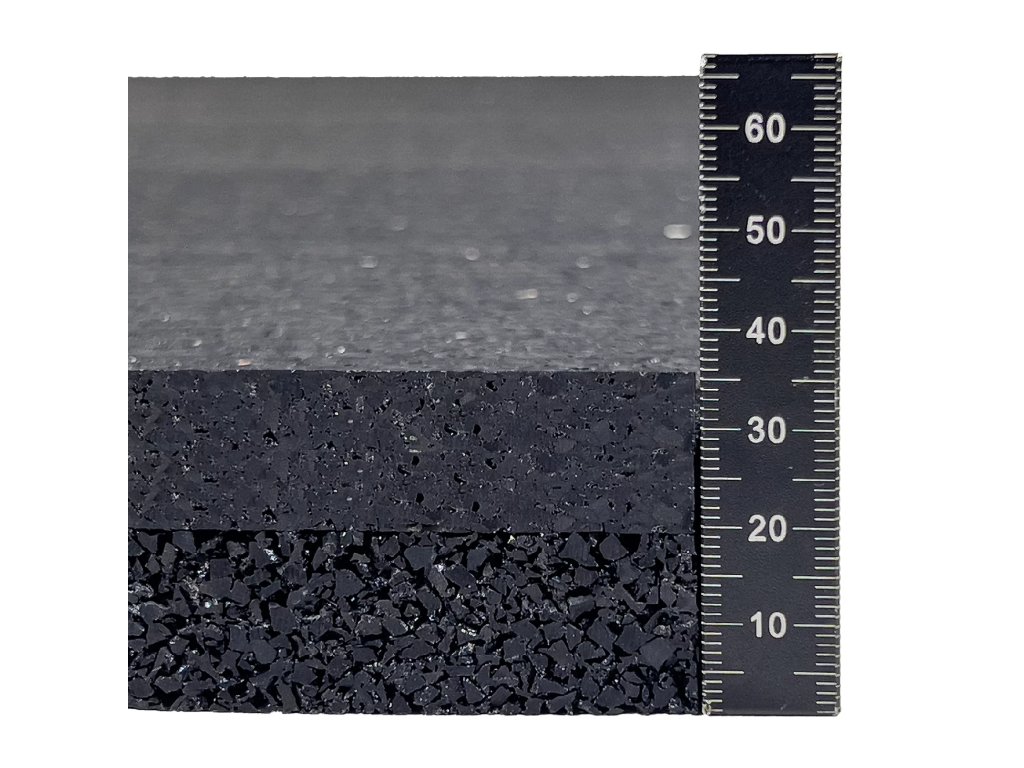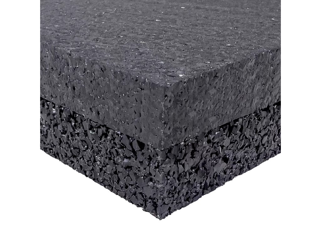 Podlahová guma (deska) SF1050 s antivibrační elastomerickou deskou S650. Kombinace fitness desky a antivibrační desky využijete především v místech, kde potřebujete odolný povrch a zároveň odtlumení vibrací. Obě desky naleznete v naší nabídce samostatně, nicméně tímto vhodným spojením získáte vlastnosti obou desek v jednom balení.
