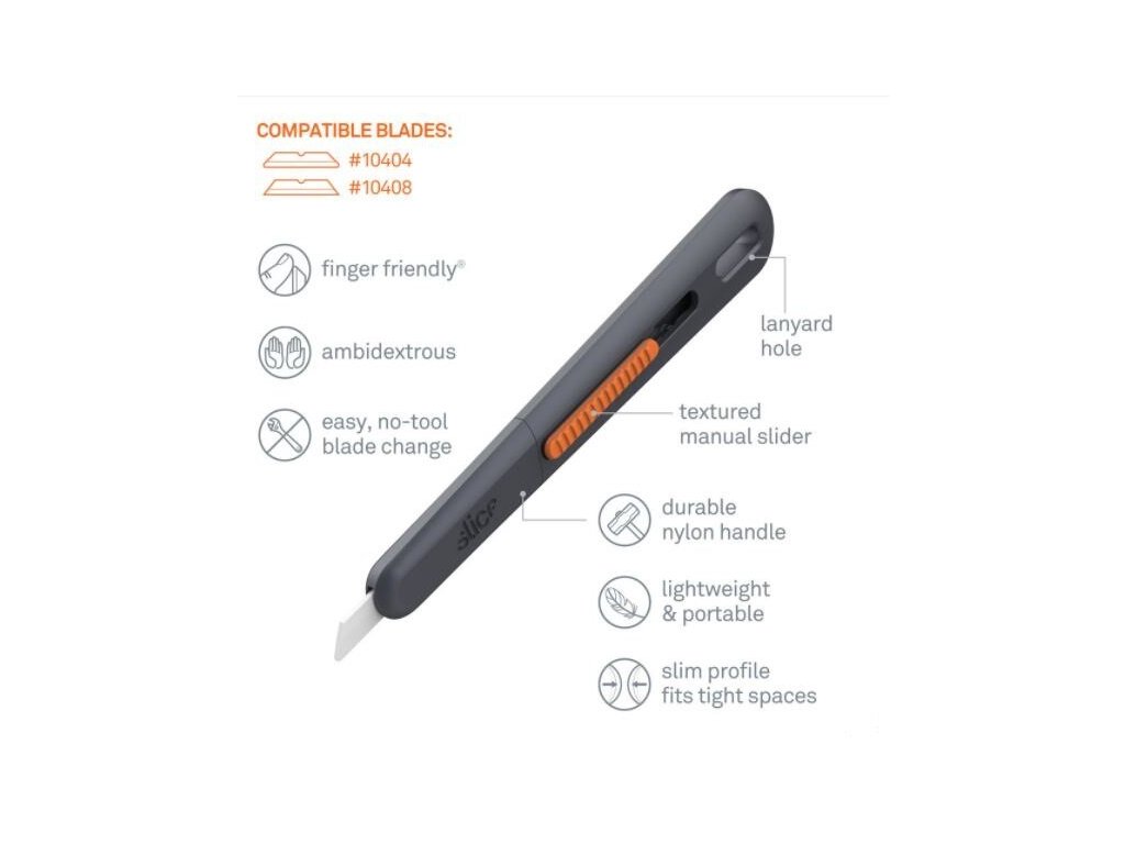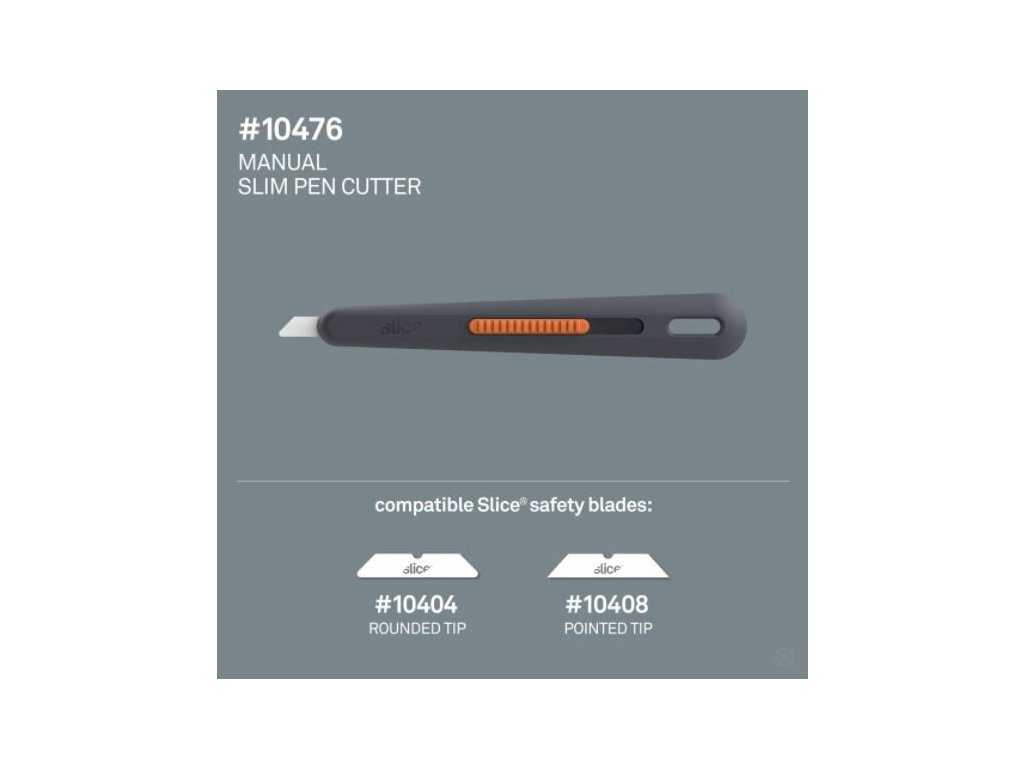Polohovatelný nůž na krabice Slice 10476 používá stejnou čepel přátelskou k prstům a stejné bezpečnostní výhody jako ostatní nože na krabice. Vlastní patentovanou jedinečnou hranu, která je bezpečná na dotek a vydrží až 11,2krát déle než srovnatelné kovové čepele. Štíhlá rukojeť umožňuje manévrování ve stísněných prostorech a je vybavena bočním posuvníkem pro snadnější manipulaci s palcem.Tento nůž používat oboustranně: stačí otočit hranu čepele v rukojeti pro leváky.