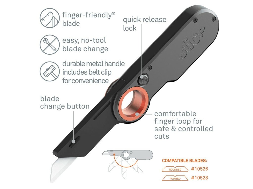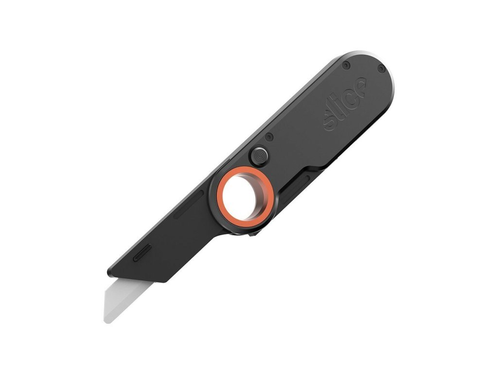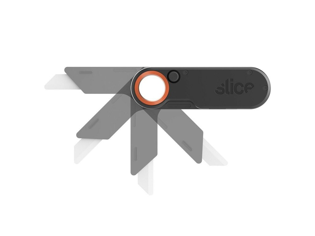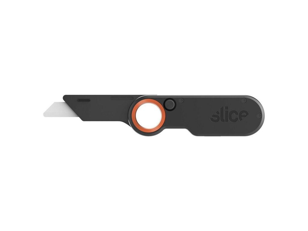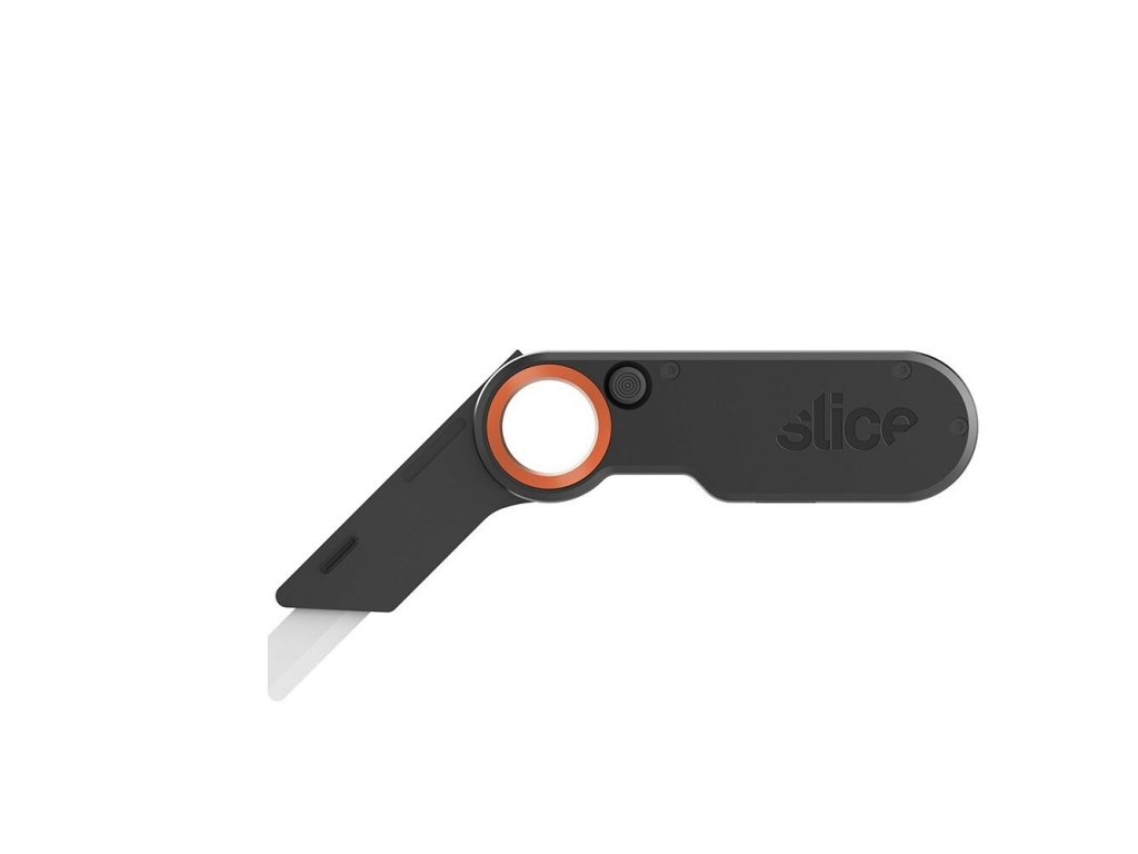 Skládací univerzální nůž Slice 10562 kombinuje vlastnosti skládacího kapesního nože s inovativními bezpečnostními prvky a keramickými čepelemi. Nůž můžete mít neustále po ruce tak, že jej zasunete do kapsy nebo pomocí přiložené spony na opasek. Až budete připraveni k řezání, stiskněte tlačítko rychlého odblokování a rozložíte bezpečný a účinný nůž. Oko pro prst poskytuje bezpečnou možnost uchopení. Nainstalovaná bezpečnostní čepel, se zaobleným hroty, vydrží až déle než standardní ocelové čepele.