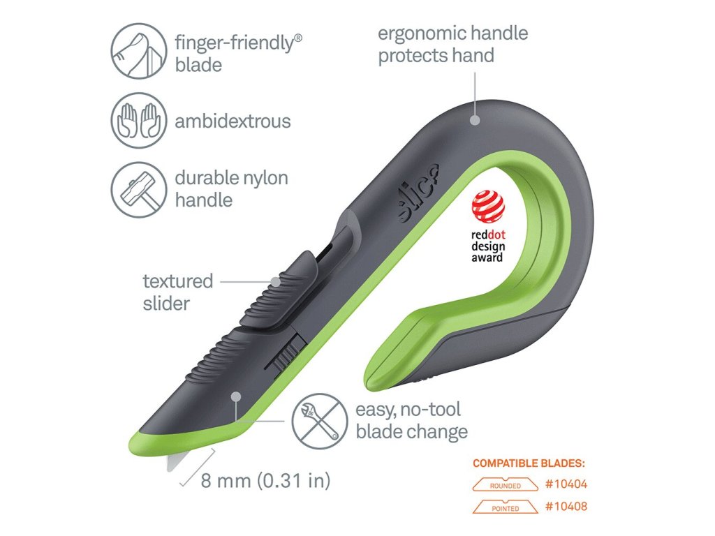 - bezpečnostní čepele Slice jsou chemicky netečné, nemagnetické, nevodivé, nejiskřivé, nerezavějící