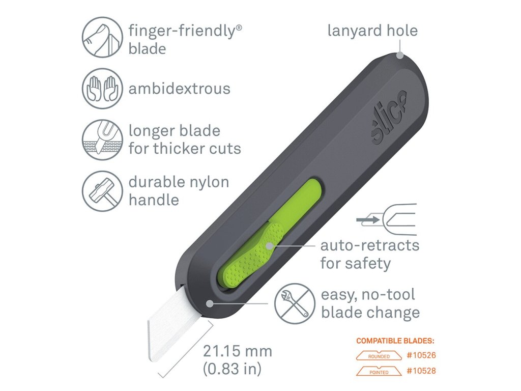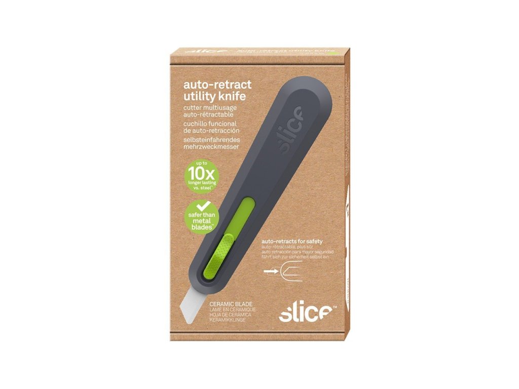 Samozatahovací univerzální nůž Slice 10554 reaguje na poptávku zákazníků po dlouhém ostří na řezání tlustých a tuhých materiálů. Po dokončení řezu se pro bezpečnost uživatele čepel, tohoto keramické bezpečnostní nože, stáhne zpět. Tento řezací nástroj je především přizpůsoben k průmyslovému použití s jedním cílem: udělat řezání bezpečnější tak, aby to nebylo na úkor efektivity nástrojů.