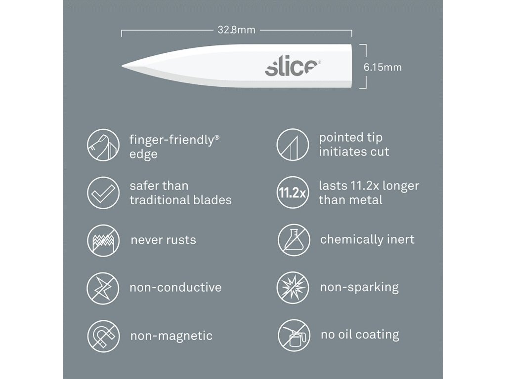 - bezpečnostní čepele Slice jsou chemicky netečné, nemagnetické, nevodivé, nejiskřivé, nerezavějící