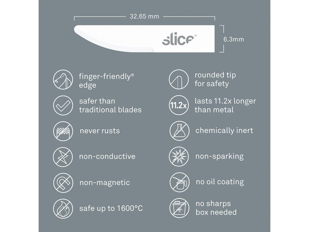 - bezpečnostní čepele Slice jsou chemicky netečné, nemagnetické, nevodivé, nejiskřivé, nerezavějící