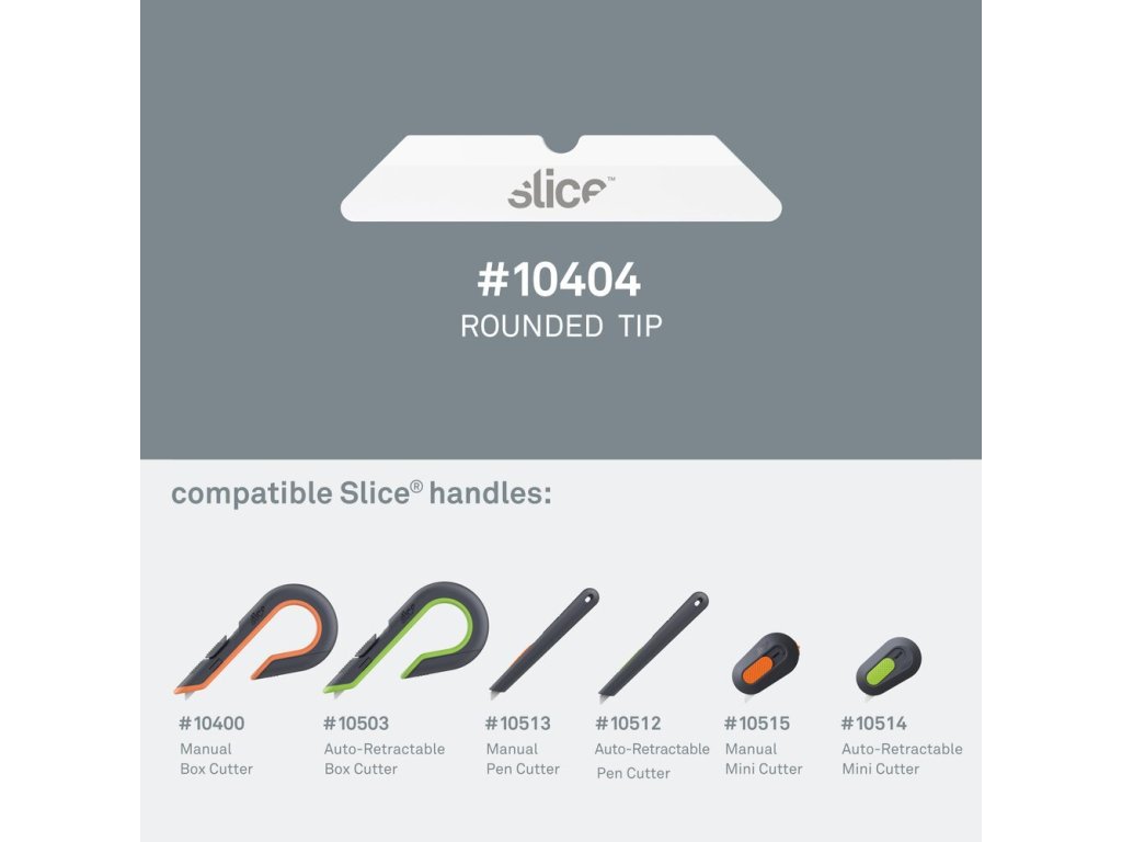 Tyto čepele jsou kompatibilní s noži: Slice 10400, Slice 10503, Slice 10514, Slice 10515, Slice 10512, Slice 10513. Zaoblená špička poskytuje zvýšenou ochranu před zraněním. Až budete potřebovat novou hranu, jednoduše oboustrannou čepel otočte.