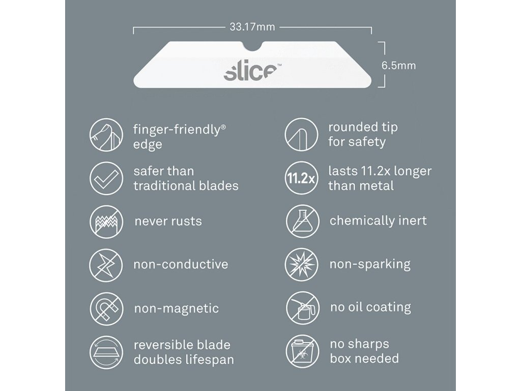 - bezpečnostní čepele Slice jsou chemicky netečné, nemagnetické, nevodivé, nejiskřivé, nerezavějící