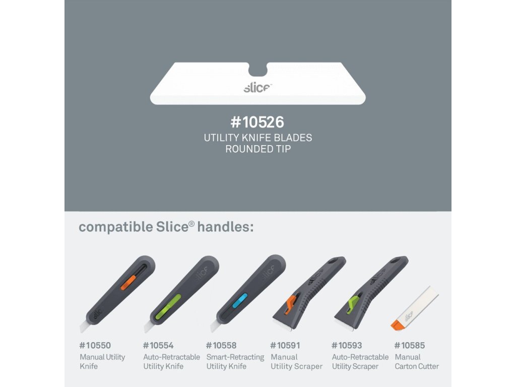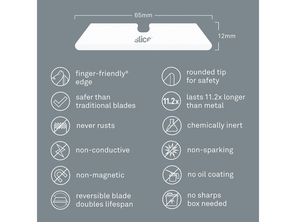 - bezpečnostní čepele Slice jsou chemicky netečné, nemagnetické, nevodivé, nejiskřivé, nerezavějící