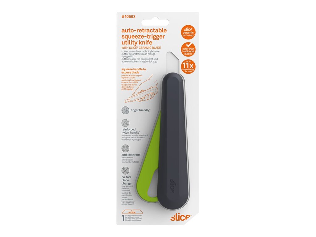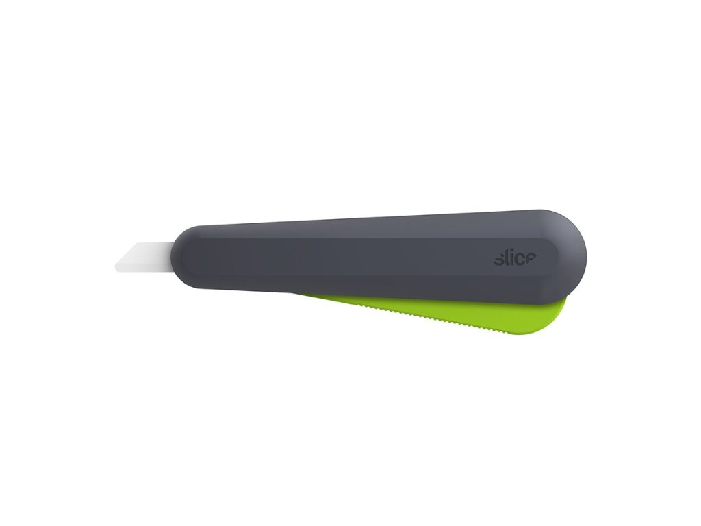 Samo-zatahovací univerzální nůž s páčkou poskytuje veškerou bezpečnost našich finger-friendly čepelí. Všechny čepele Slice mají speciální ostří, které efektivně řeže a zároveň je bezpečné na dotyk, takže se nemusíte bát závažných poranění. Uzamykací funkce zabraňuje vysunutí čepele, když se nůž nepoužívá.