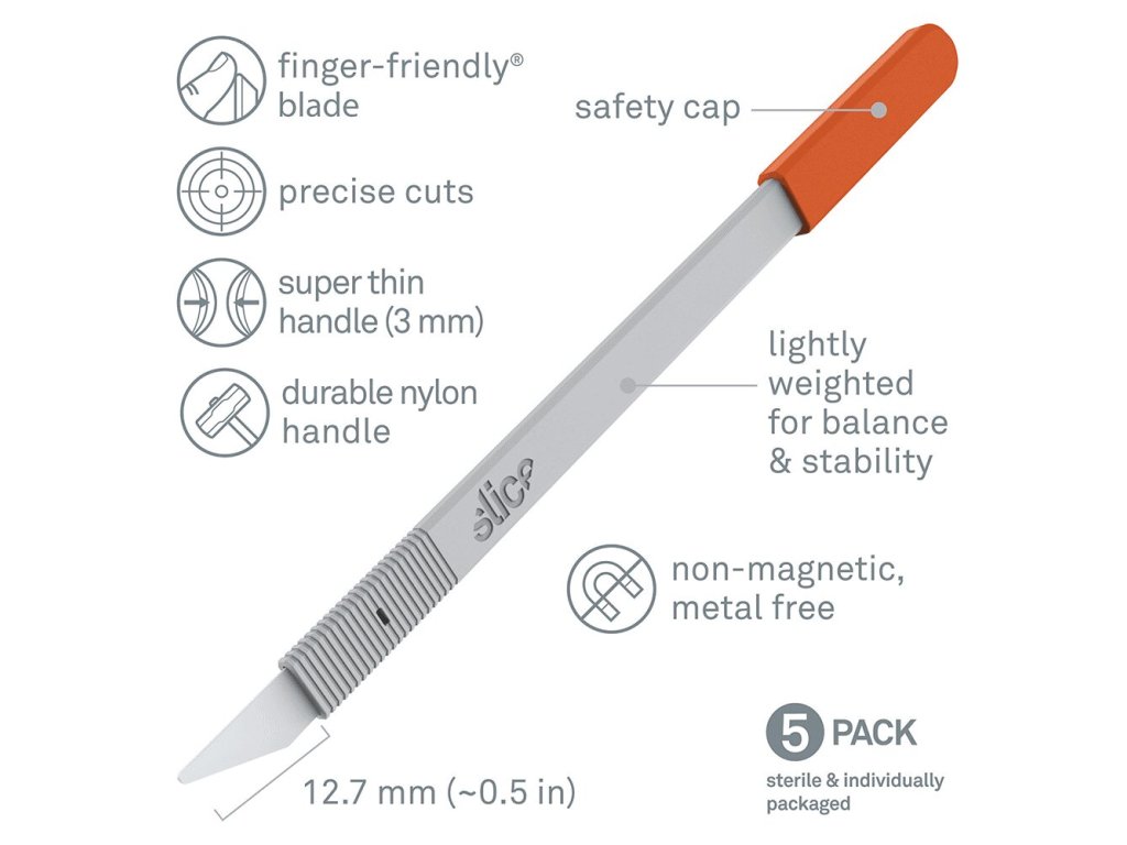 Jednorázové keramické přesné nože Slice 10574 jsou vybaveny stejnými bezpečnostními čepelemi jako ostatní Slice nože, ale s lehkou, tenkou rukojetí pro manévrovatelnost (rukojeť je pouze 3 mm tlustá bez krytky). Silná, štíhlá skleněná nylonová rukojeť tohoto sterilního jednorázového skalpelu zaručuje přesné řezy. Tento nůž není určen pro úkony, které skutečně vyžadují ultra ostrou čepel např. operace, ale poskytuje bezpečnější volbu pro laboratorní, řemeslné a výrobní použití.
