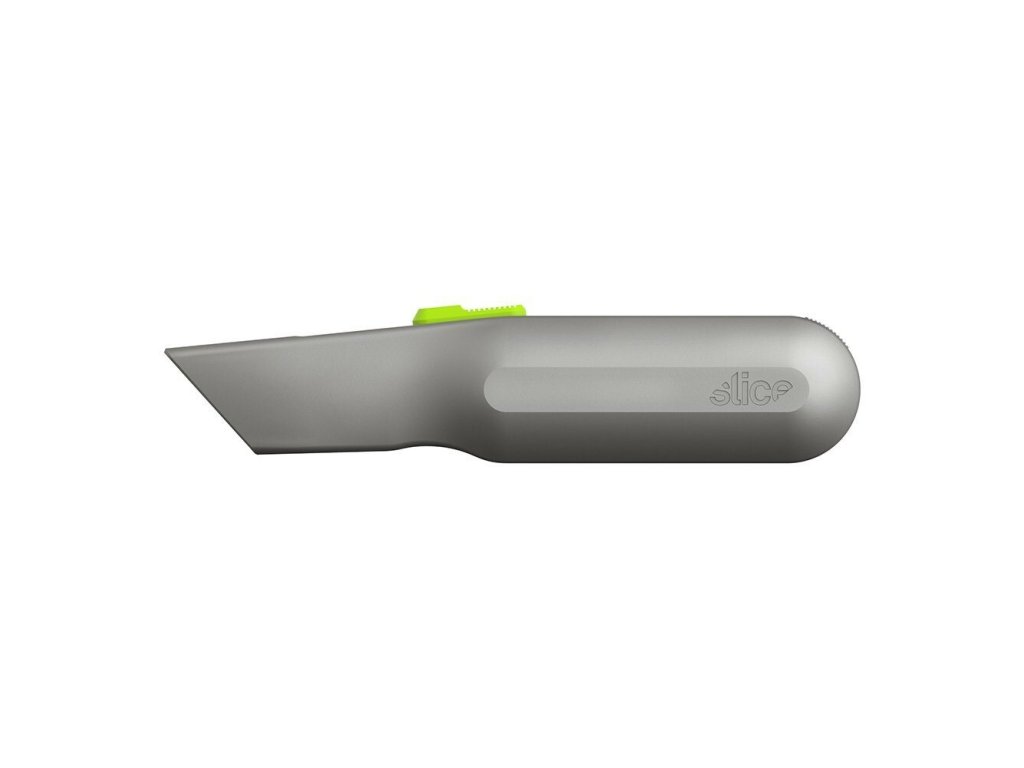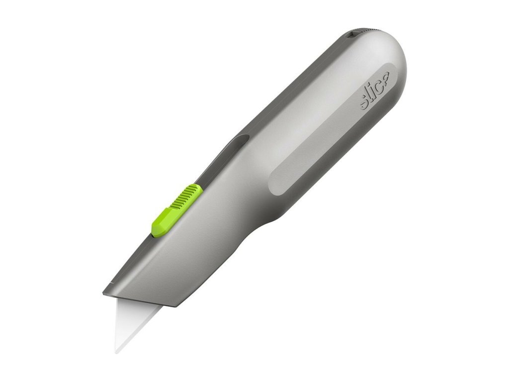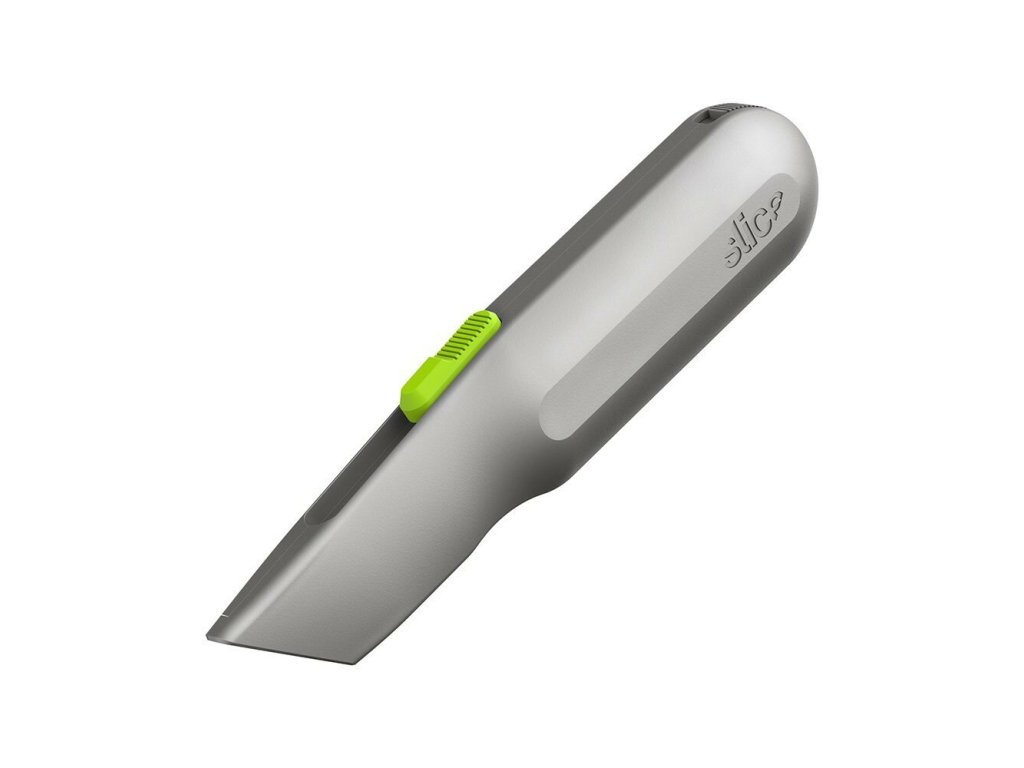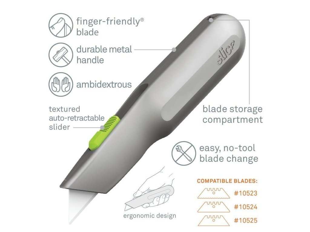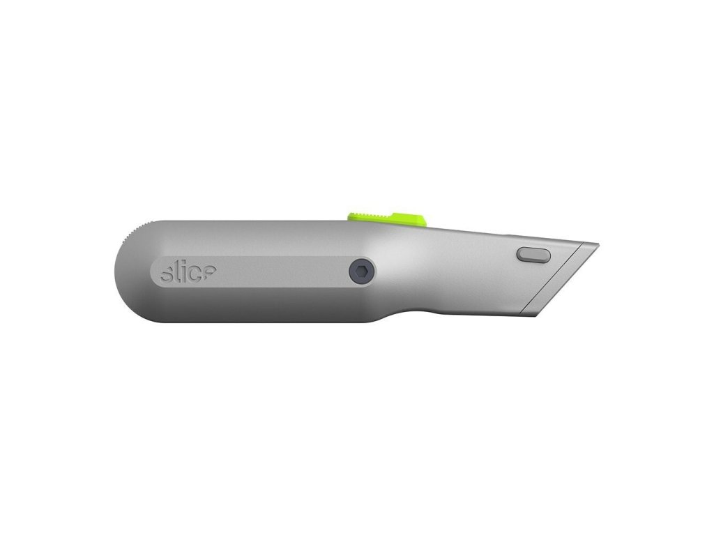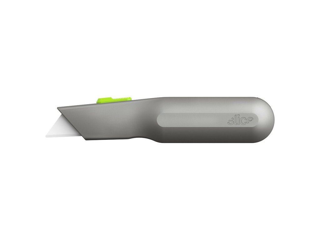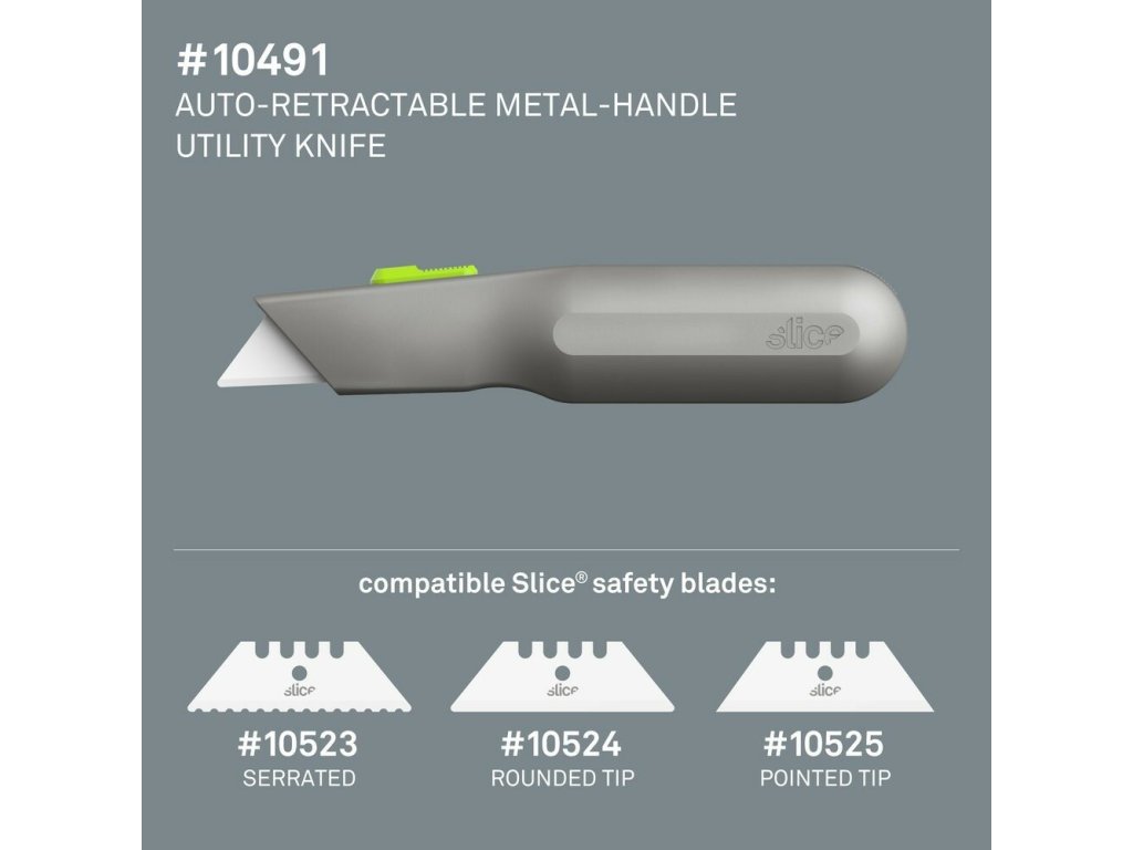 Samozatahovací univerzální nůž Slice 10491 kombinuje elegantní ale zároveň robustní kovovou rukojeť s patentovanou bezpečnostní čepelí pro výkonný a bezpečný nástroj. Dodáván je s čepelí, jenž se při uvolnění posuvníku automaticky zatáhne. Čímž se zajistí, že se ostří nikdy samovolně nevysune. V rukojeti nože je také zabudován vestavěný zásobník na náhradní čepele.