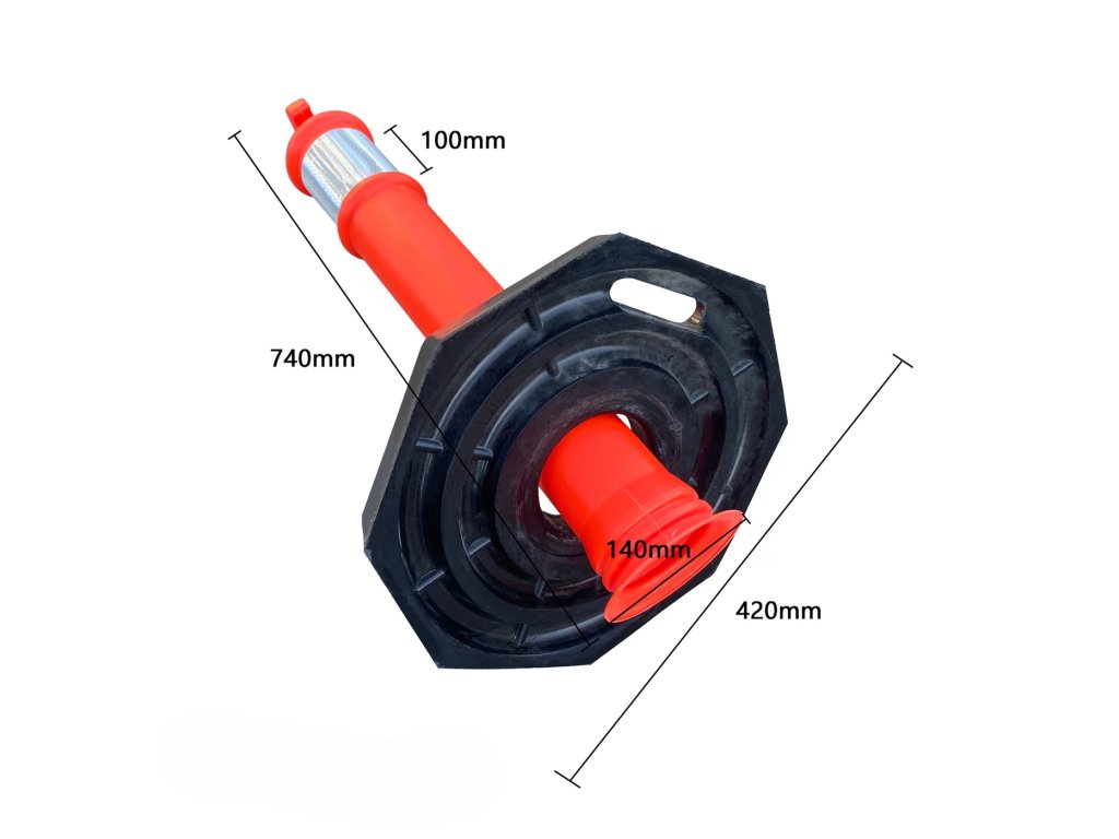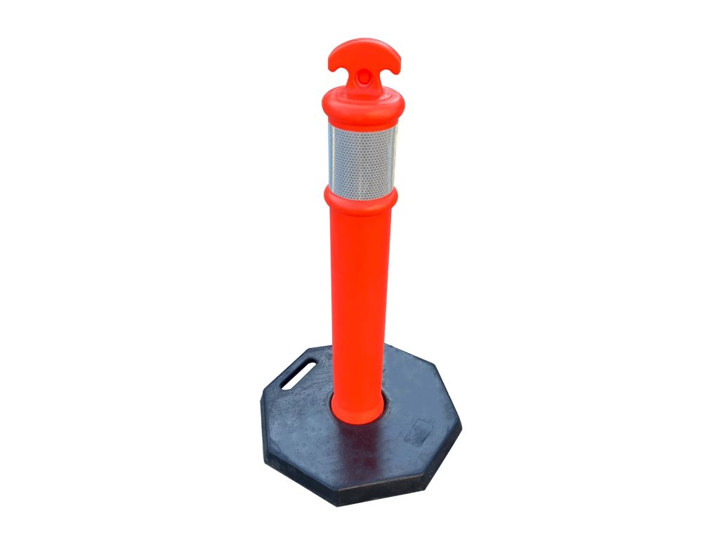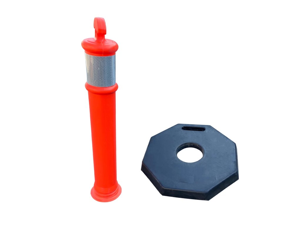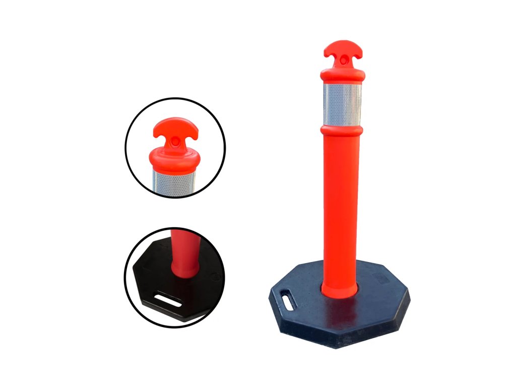 Plastový vymezovací sloupek s gumovou základnou představuje profesionální řešení pro řízení dopravy a organizaci prostoru s důrazem na maximální stabilitu. Tento sloupek slouží jako vysoce viditelná bariéra, která pomáhá usměrňovat vozidla, vymezovat parkovací plochy nebo chránit chodce a budovy v logistických i městských areálech. Díky své robustní konstrukci je ideální pro místa, kde je vyžadována odolnost proti povětrnostním vlivům a stabilní umístění bez nutnosti pevného kotvení.
