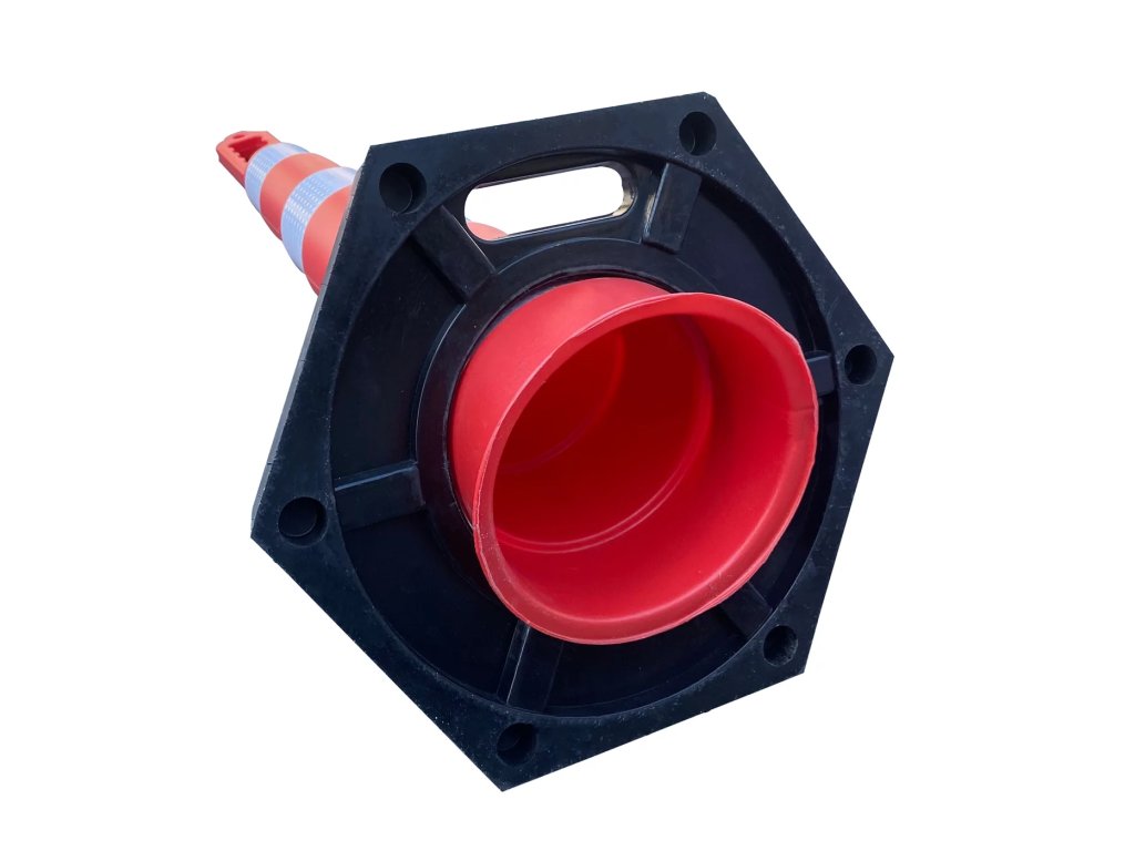 Plastový sloupek vyniká svou stabilitou díky masivní gumové základně o hmotnosti 5 kg s průměrem 48 cm, která bezpečně ukotvuje vysoký profil sloupku i bez nutnosti vrtání do podkladu. Celý prvek je vyroben z vysoce kvalitního polyethylenu (PE), který vyniká elasticitou a tvarovou pamětí. Materiál je plně odolný vůči UV záření, oděru i extrémním teplotám, což zajišťuje jeho dlouholetou životnost a barevnou stálost v náročném venkovním prostředí.