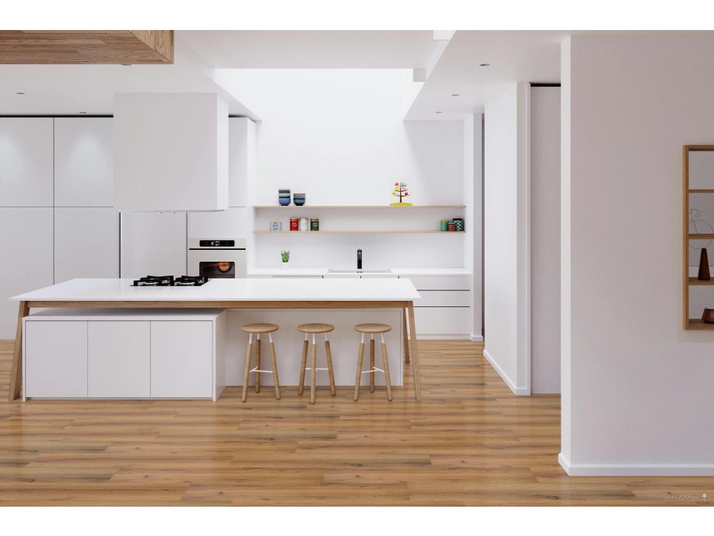 Voděodolnost: Díky 100% voděodolné konstrukci je podlaha ideální pro kuchyně, koupelny a další prostory, kde může docházet k kontaktu s vodou.